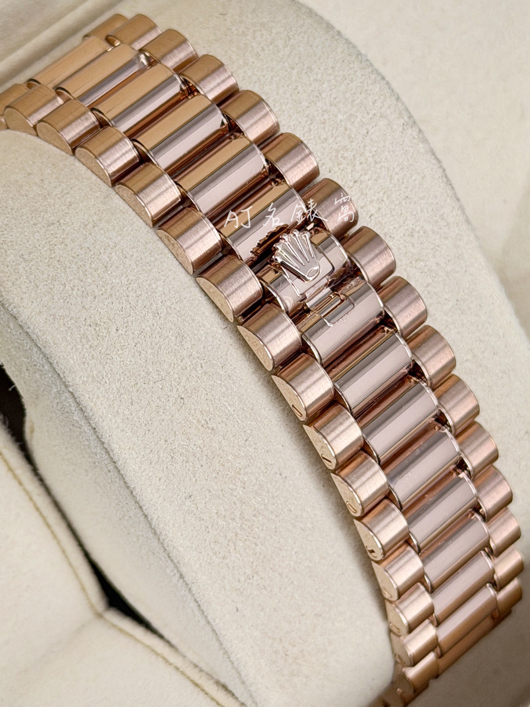 永恆玫瑰金材質錶殼、錶鍊帶 隱蔽式摺疊皇冠帶扣 |