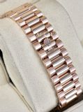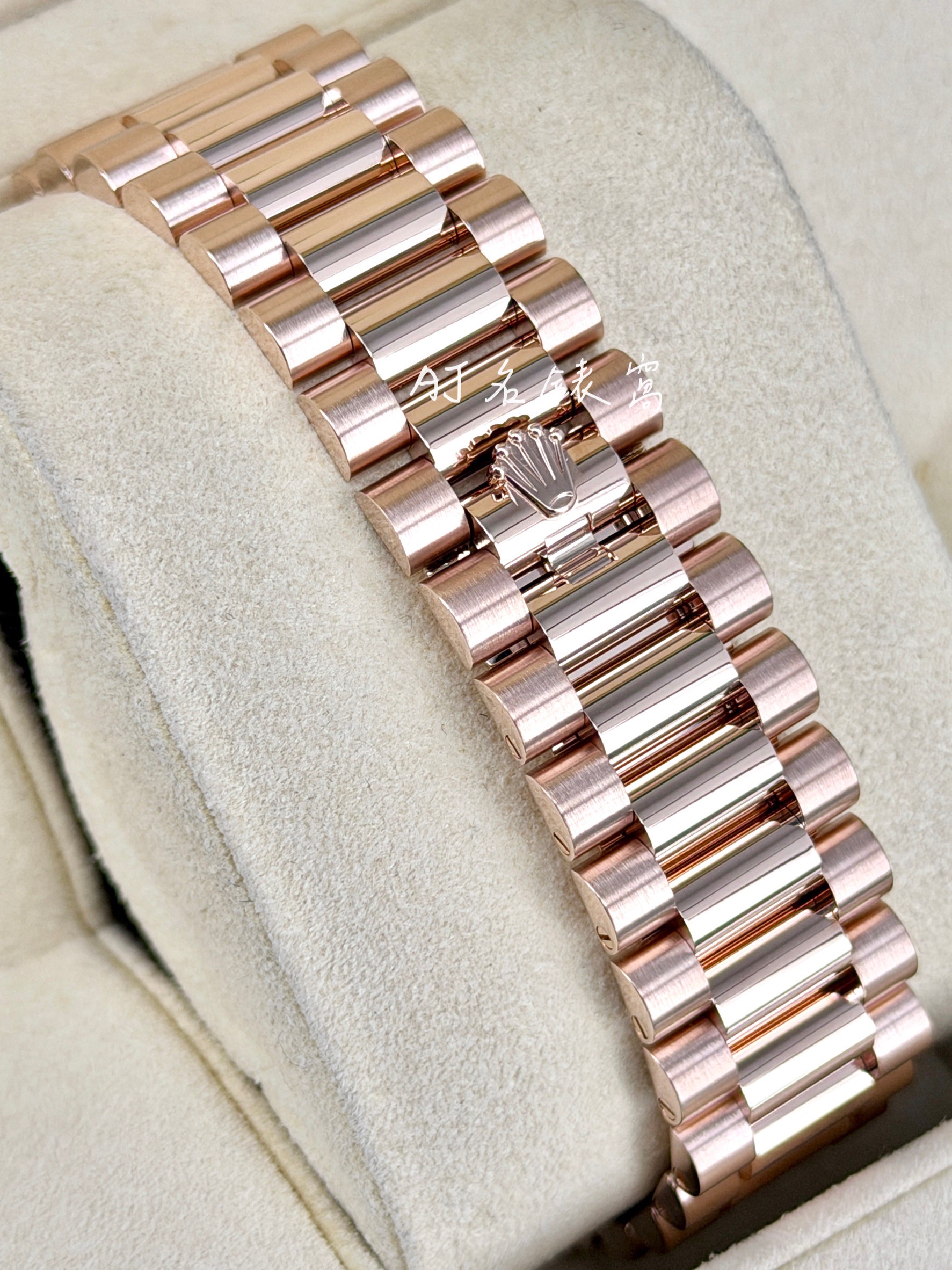永恆玫瑰金材質錶殼、錶鍊帶 隱蔽式摺疊皇冠帶扣 |