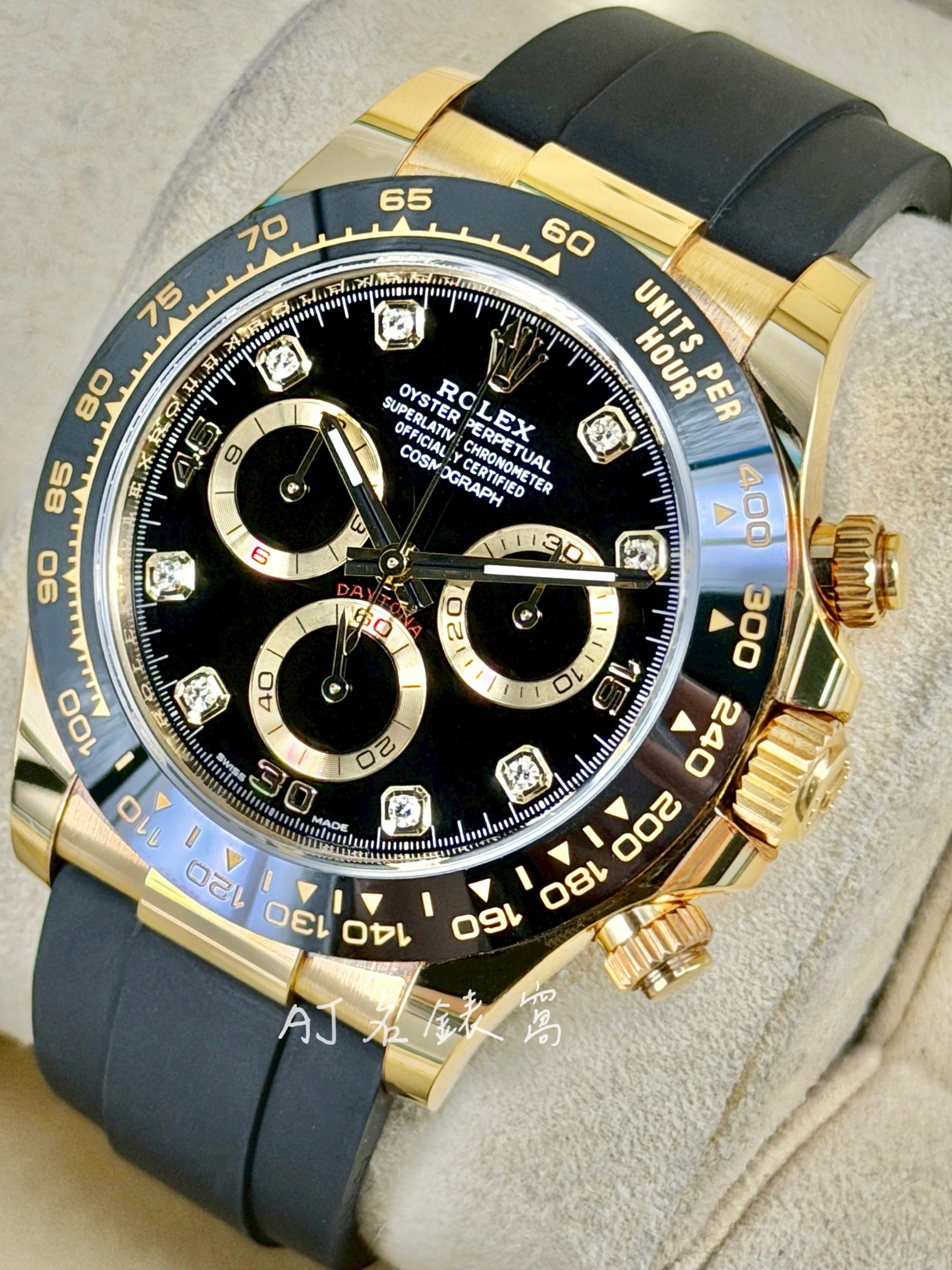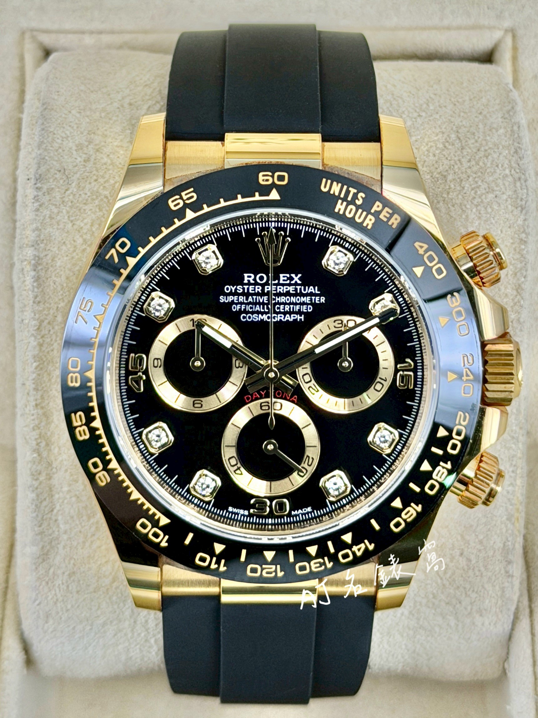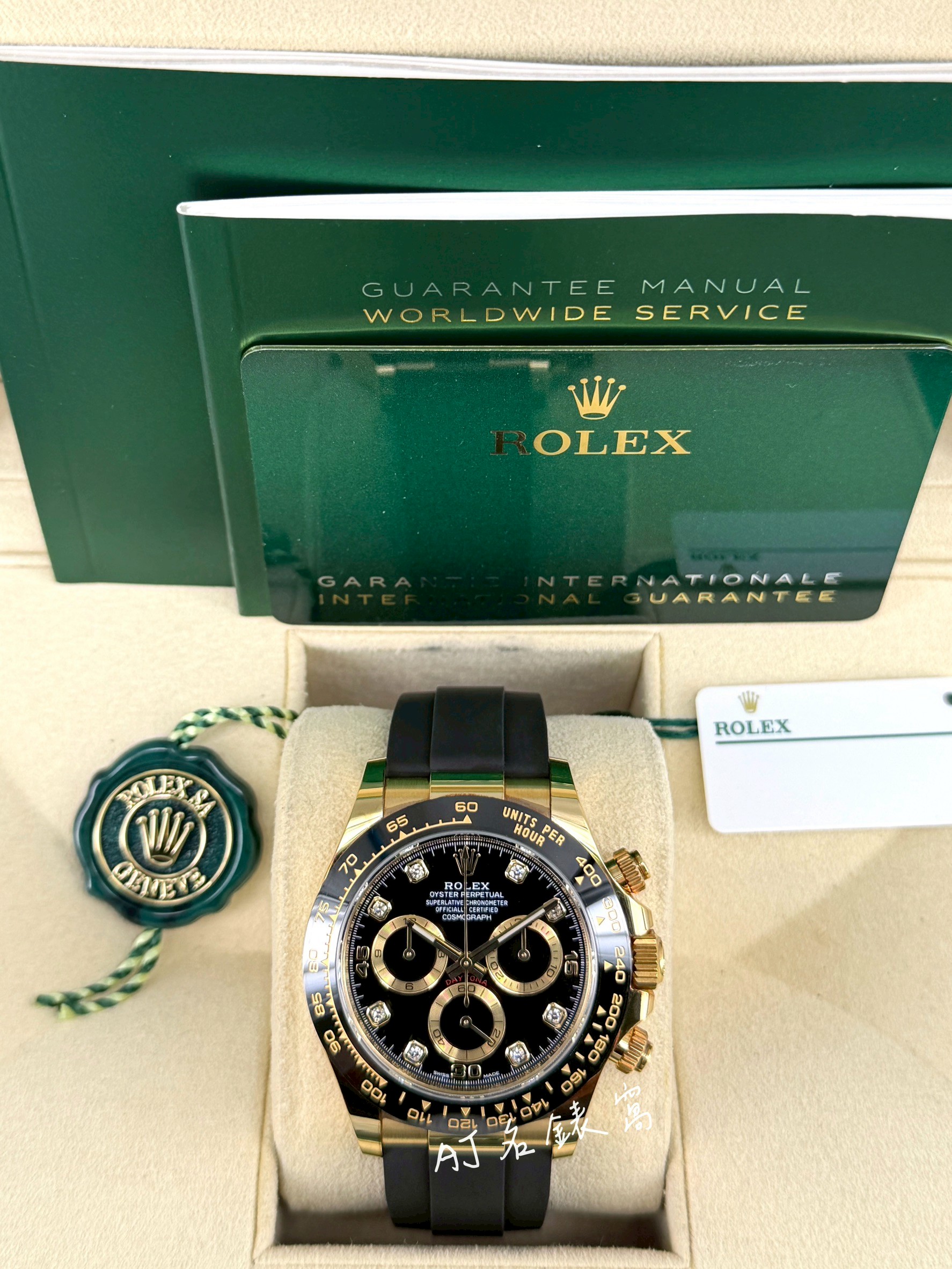 OYSTER PERPETUAL COSMOGRAPH DAYTONA 腕錶18K黃金款 搭配鑲鑽黑色錶面及OYSTERFLEX錶帶 黑色CERACHROM外圈設測速計 16518G 新款閃圈 2021年保單 二手美品
