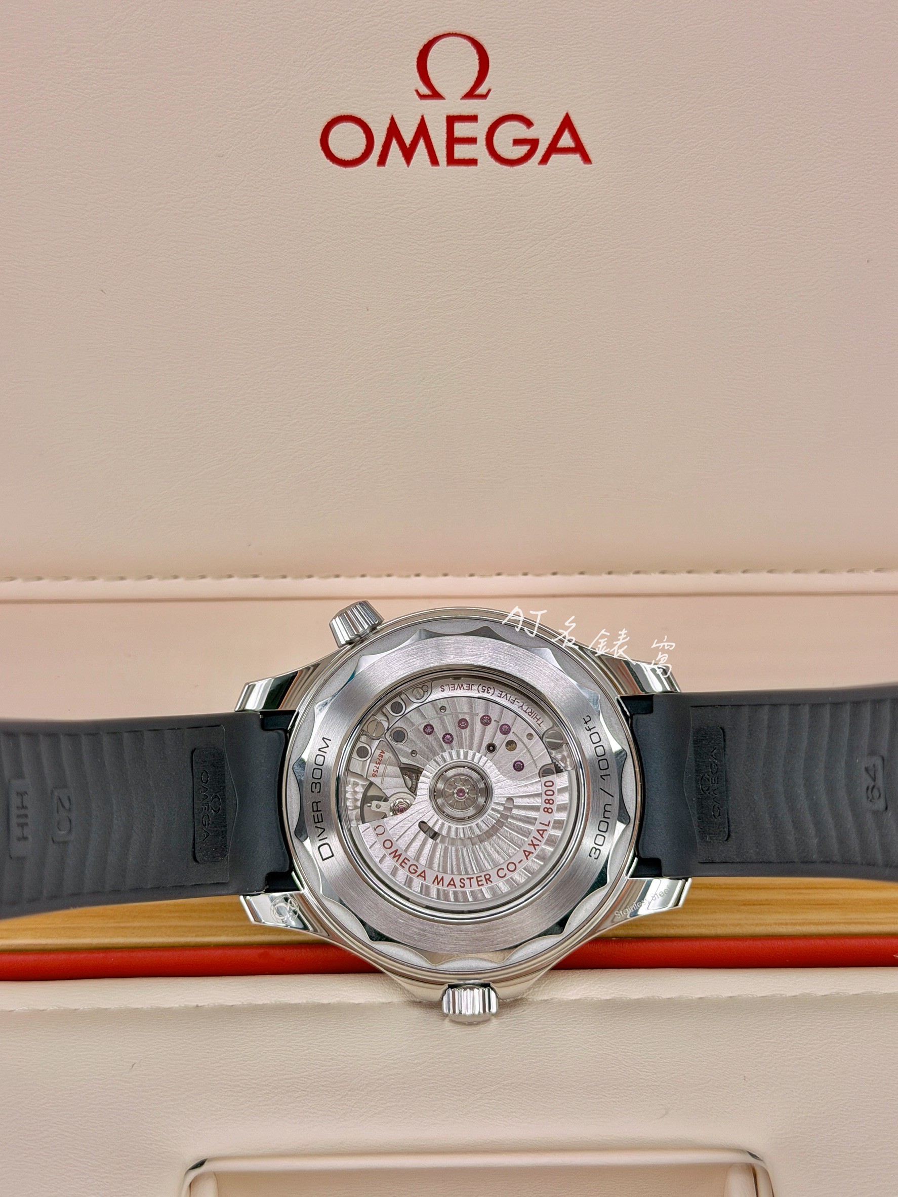 功能: 時、分、秒大三針時間指示 / 日期窗顯示 / 專業300米防水 機芯: 歐米茄錶原廠cal.8800搭配同軸擒縱自動上鍊機械機芯
