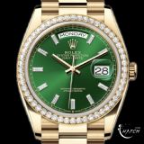 |  | ROLEX 勞力士 Day-Date 星期日曆型 128348RBR 原廠鑲鑽錶圈 T鑽時標 漸變綠色面盤 18K黃金材質 總統帶 2024年保單 二手美品 自動上鏈 36mm
